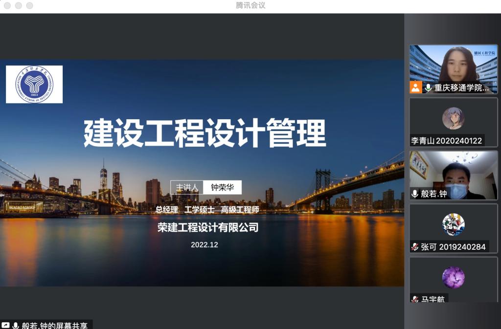 为持续不断地增强移通学子对创新创业内容的了解,提升创新思维,拓宽创业途径,12月15日晚上7点,由德国工程学院雅思英语教研室主任向觅老师主持,荣建工程设计有限公司创始人钟荣华主讲的以“建设工程设计管理”为主题的企业高管进课堂暨第85期创业沙龙在腾讯会议成功开展,全校多名师生参与。钟总的讲座共分为4个部分:建设工程分类,设计流程管理,质量管理以及职业规划。在建设工程分类中,钟总介绍到:按自然属性分别有建...