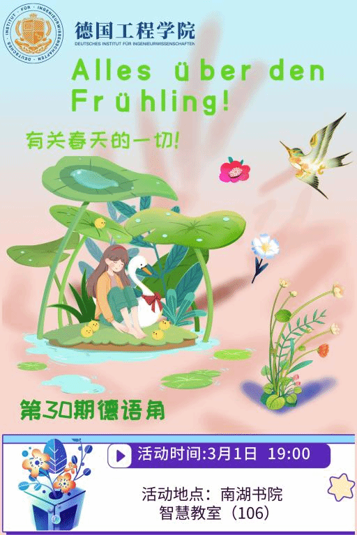 寒冬已过,春天的气息悄然而至。3月1日,德国工程学院在南湖书院举办了第三十期德语角活动,本期活动的主题是“Alles über den Frühling(有关春天的一切)”,除了德语外教Julio,我院中外合作办学项目的同学也在导师的陪同下参与了本期活动。本期德语角以一篇充满春天气息的文章DerFrühling开始。外教Julio带领大家逐字逐句地齐读文章,同学们一边大声朗读,一边想象、感受着文章中的美丽春色。同时,Julio还...