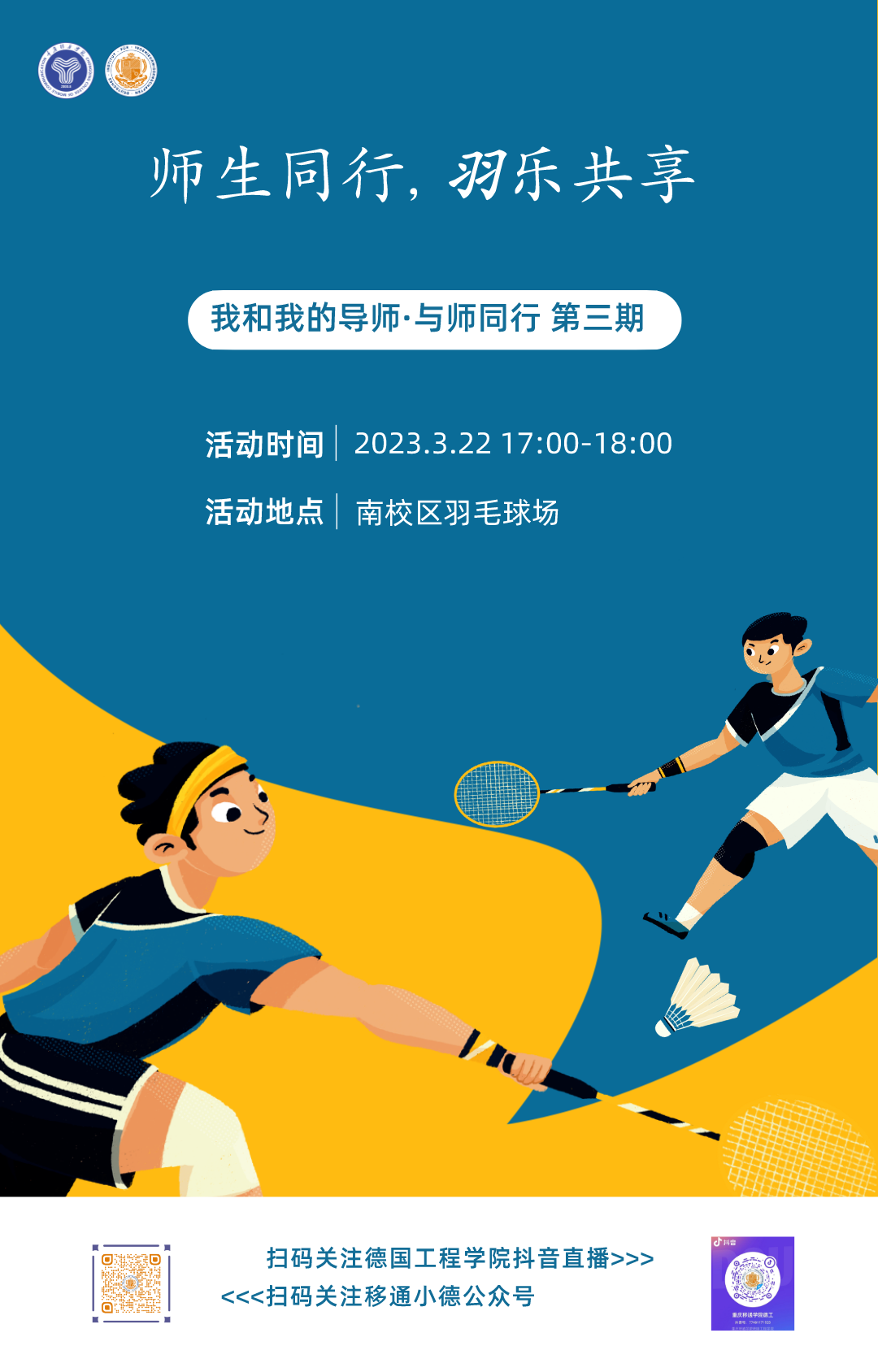 继上期乒乓球运动后“我和我的导师·与师同行”系列活动第三期来啦本次为羽毛球友谊赛将于3月22日在南校区羽毛球场举行欢迎大家扫码观看直播积极互动参与抽奖德国工程学院供稿