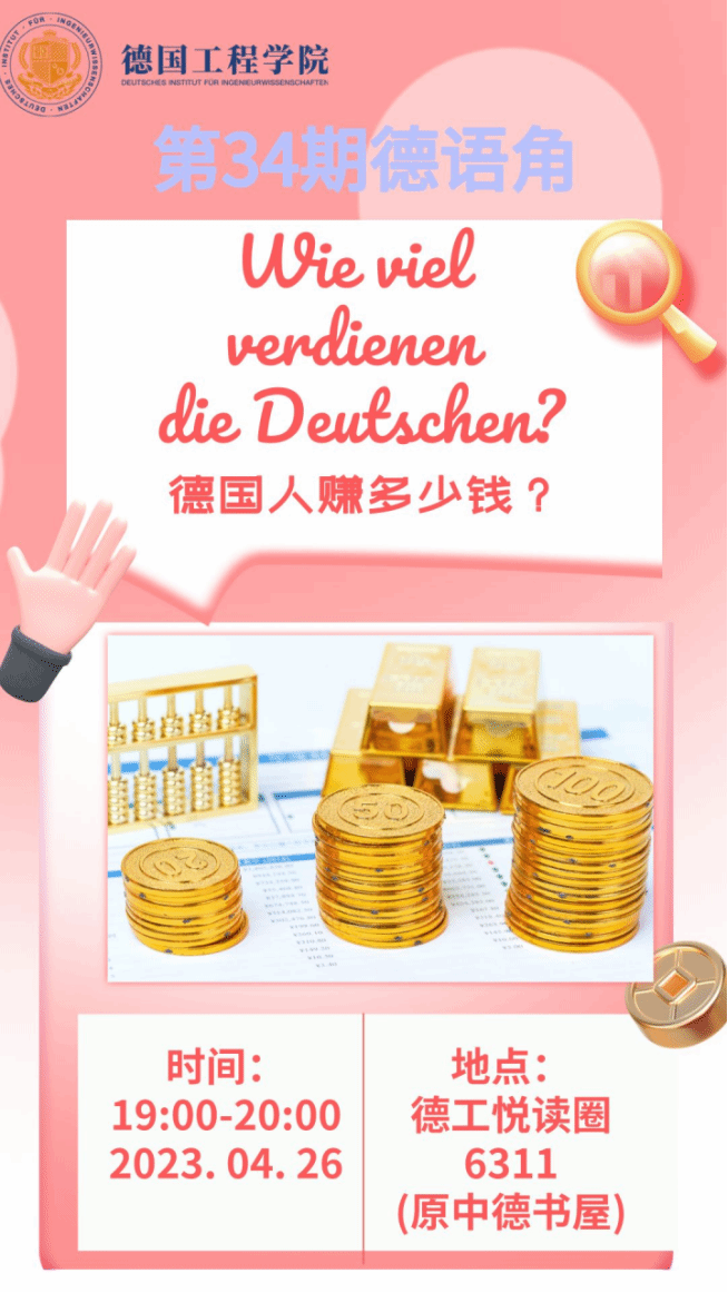 你知道德国人的薪资待遇如何吗?你想了解中德两国在工作与报酬方面的区别吗?你好奇德国人的职场都有哪些福利吗?你愿意更深入探讨中德文化差异吗?加入本周的德语角吧,和外教Julio一起,用德语畅谈理想和现实!学派报名号:231102801