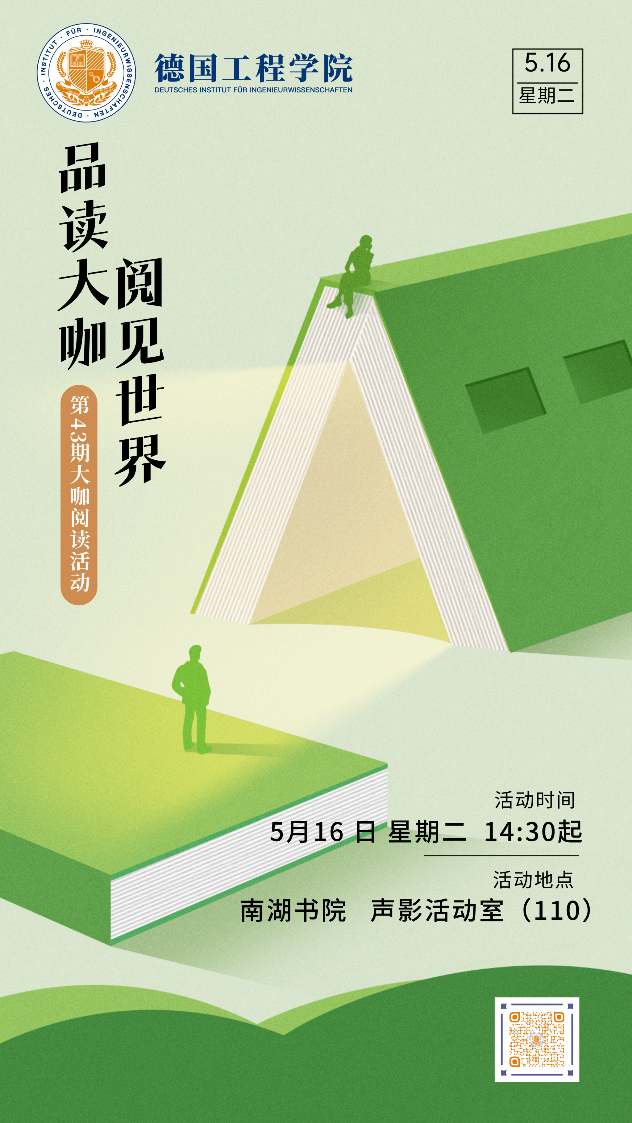 品读大咖,阅见世界德国工程学院第43期大咖阅读活动来了!活动时间:2023年5月16日 14:30起活动地点:南湖书院 声影活动室(110)报名方式:悠学派德国工程学院供稿