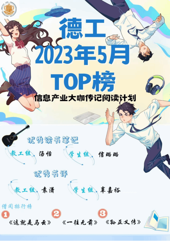 恭喜以上师生荣登“德工2023年5月TOP榜单”!用篇篇读书笔记、书评呈现出了大咖传记的商科素养文化,借阅图书排行榜前三名分别为《这就是马云》、《一往无前》、《孙正义传》。让我们与上榜的师生共同努力,继续发送出丰富感悟,大家的热情和认真会凝聚在篇篇优秀的作品里。新一轮的线上征集活动来了,6月信息产业大咖传记阅读计划之书籍读书笔记、书评征集活动再度来袭!征集活动时间:2023年6月1日-6月25日,内容围绕大咖传记书单。...