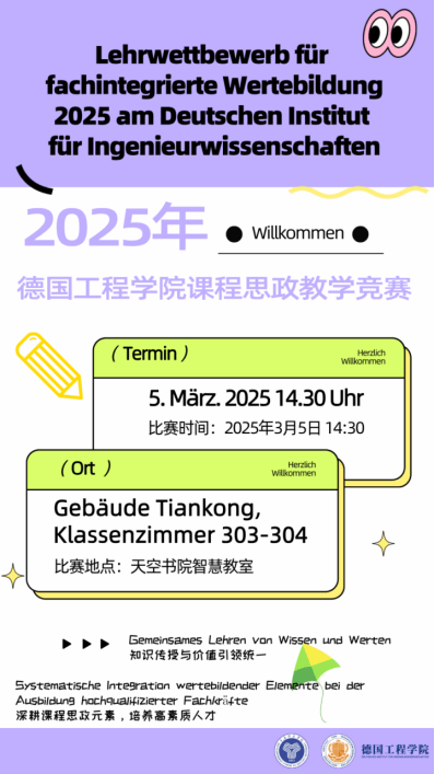 三尺讲台,立德树人!备受期待的“2025年德国工程学院课程思政教学比赛”即将举行!各位优秀教师将齐聚一堂,同台竞技,展现课程思政教学的独特魅力!他们将如何将思政元素巧妙融入专业课堂,引导学生思考人生价值? 又将如何用生动的案例和鲜活的表达,激发学生的学习兴趣和社会责任感?让我们拭目以待!精彩不容错过,欢迎广大师生前来观摩学习!