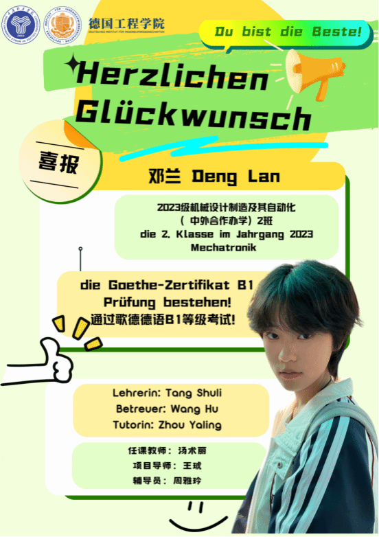 近日,我院2023级机械设计制造及其自动化(中外合作办学)2班的邓兰同学在歌德德语B1等级考试中表现出色,顺利通过考试,取得了优异的成绩!歌德德语B1等级考试是国际认可的德语水平测试,对考生的德语综合运用能力提出了较高的要求。邓兰同学凭借扎实的语言基础、良好的学习习惯和积极的学习态度,在此次考试中取得了令人瞩目的成绩。希望同学们以邓兰同学为榜样,努力学习,不断提高自己的外语水平,为实现自己的梦想而努力奋斗!...