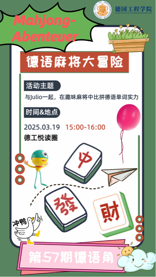 亲爱的同学们:想在轻松愉快的氛围中提升德语词汇量吗?想和外教一起用麻将玩出新花样吗?本周,我们诚挚邀请你加入“德语麻将大冒险”,开启一场别开生面的德语学习之旅!将德语学习与麻将游戏相结合,让学习不再枯燥,轻松掌握德语单词。与外教面对面交流,感受纯正的德语发音和语言表达,提升口语能力。以小组形式参与游戏,培养团队合作精神,结交志同道合的朋友。快登录指尖派报名参加吧!让我们在麻将的欢乐中,一起探索德语的奥秘,...