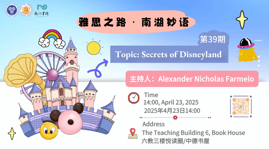 亲爱的同学们:第39期“雅思之路·南湖妙语”活动即将开启!欢迎各位同学参与。时间:2025年4月23日(本周三)14:00地点:六教三楼悦读圈/中德书屋报名方式:登录微信小程序“指尖派”报名参与欢迎各位同学加入,和外教Alex一起开启英语学习之旅!See you there!