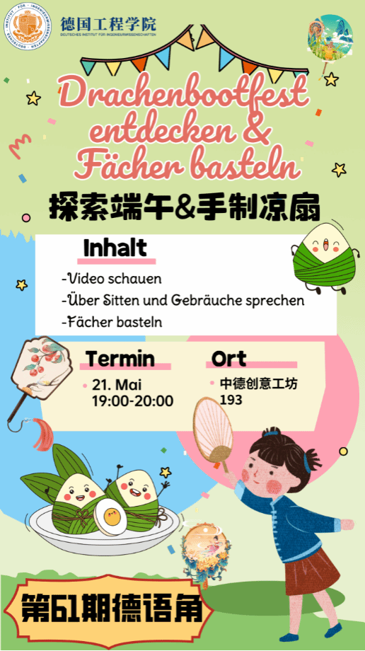 端午文化狂欢——看视频、聊习俗、做手工!�� 你准备好开启一场穿越语言与传统的端午冒险了吗?本周德语角将带你沉浸式探索端午节(Drachenbootfest)的神秘魅力!这不仅仅是一堂德语课,更是一场文化派对!在这里,你可以观看德语版的端午短片;你可以用德语进行文化探讨;你不仅能学到地道德语表达,还能亲手制作专属端午纪念品——DIY你的专属端午折扇,做完还能带走,夏日清凉必备!更有机会赢取神秘小礼物!无论你是德语大神还是刚入门的小白,...