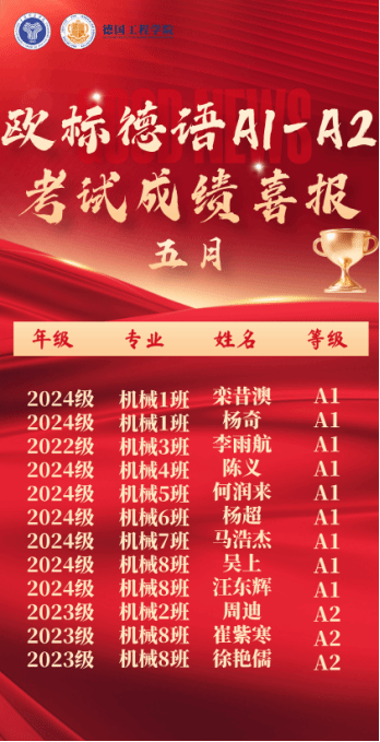 热烈祝贺我院学子在5月份欧标德语等级考试中斩获优异成绩!这份闪耀的成绩单,是同学们晨读暮练的汗水结晶,也是老师们辛苦耕耘的实践硕果。未来,愿你们以语言为舟,以文化为帆,在通向世界的航道上继续破浪前行!学院将以更开放的资源、更前沿的课程,助力每一位德工学子书写国际化的青春篇章!