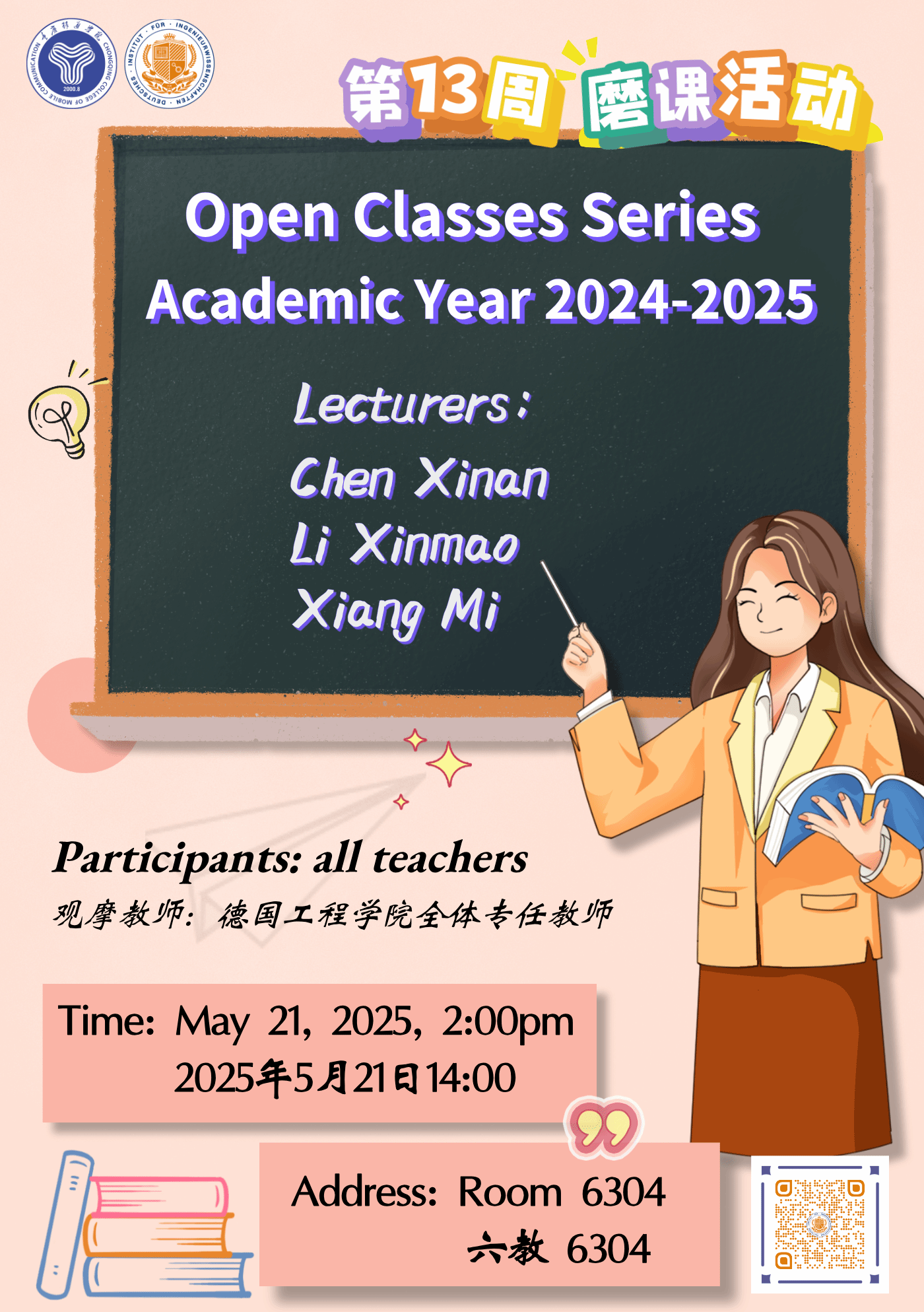 2025.05.23以课堂为基,锤炼教书育人匠心;用互动为桥,架设师生共进阶梯;携智慧碰撞之火,熔铸教学精进之魂;汇众师所长之光,照亮评估攻坚之路!德国工程学院2024-2025学年第二学期第13周教师集体磨课活动即将开启,欢迎各位老师参与。让我们并肩同行,以卓越教学赋能学生成长,以团队智慧迎接评估挑战!