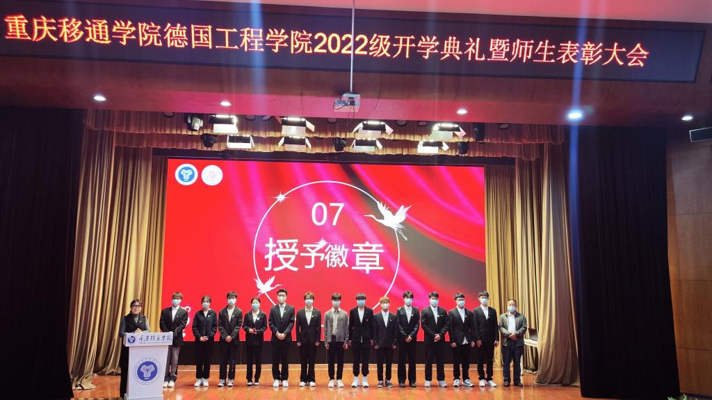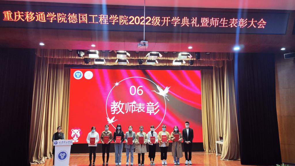 金秋十月,略有些许的寒意,但遮挡不住2022级新生昂扬的浩然之气。10月26日下午,重庆移通学院德国工程学院2022级开学典礼暨师生表彰大会在下里巴人剧场隆重召开,并于南湖书院声影活动室和中德创意工坊设立直播分会场。典礼由德国工程学院副院长侯宇晶主持,重庆移通学院校长助理尹浩亮出席典礼,2022级教师代表和辅导员、师生表彰代表及新生代表共同参加。