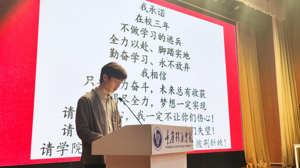 随后尹助理代表学院为学生代表佩戴定制徽章,德工归属感和自豪感油然而生。新生代表田大林在发言中表达了对圆梦德工的欣喜与期待。柴文涛同学带领全体新生宣誓,昂扬的誓言响彻整个会场。最后全体师生合唱“我和我的祖国”,正如誓言和歌词里那样,所有师生都会脚踏实地,努力付出,以昂扬的斗志,以拼搏的精神,在我们热爱的祖国大地上,不负韶华,展现德工师生风采。
