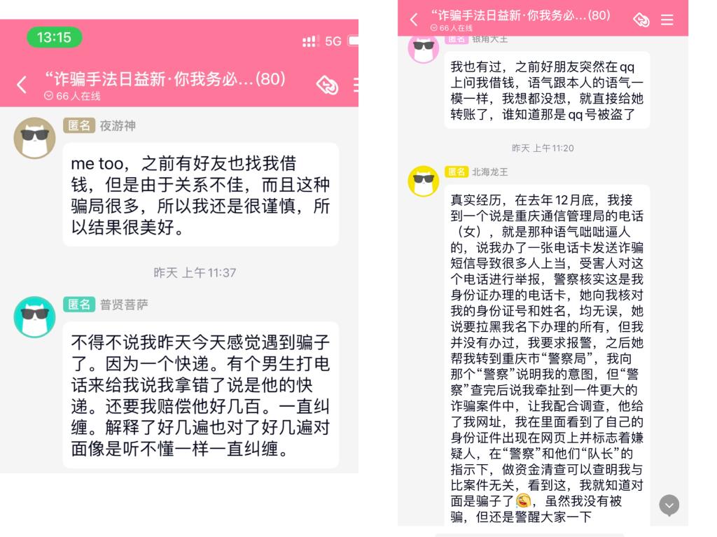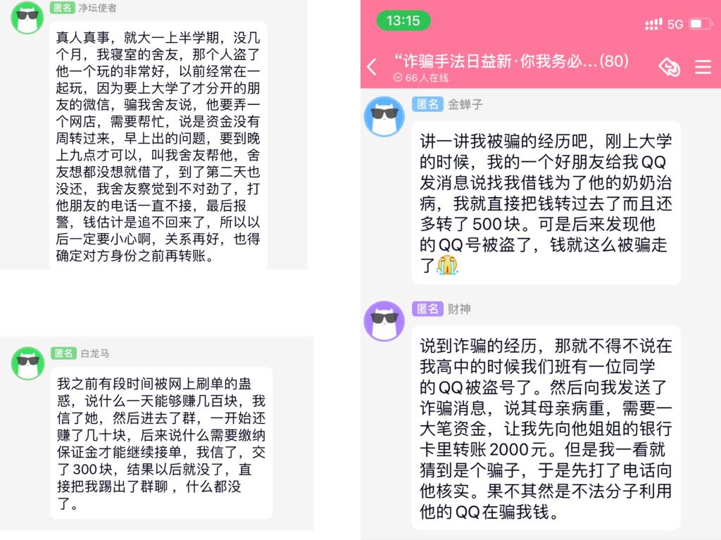 活动伊始,参赛者们在竞赛群中便展开激烈讨论,纷纷分享自己熟知的骗局和诈骗手法,其中包括但不限于刷单返利,中奖短信,转账电话等。通过本次分享帮助学生们增强自身对电信诈骗的认识和预防。