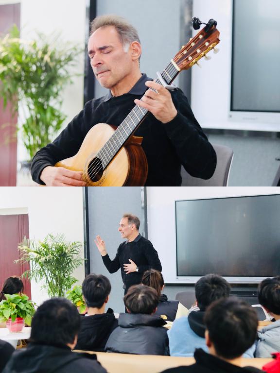 外教Clive首先进行自我介绍,作为校园“名人”,以幽默风趣著称,从简单的几句话几个动作就可见其独特风格。接着以一段吉他solo,把大家代入古典音乐的氛围。