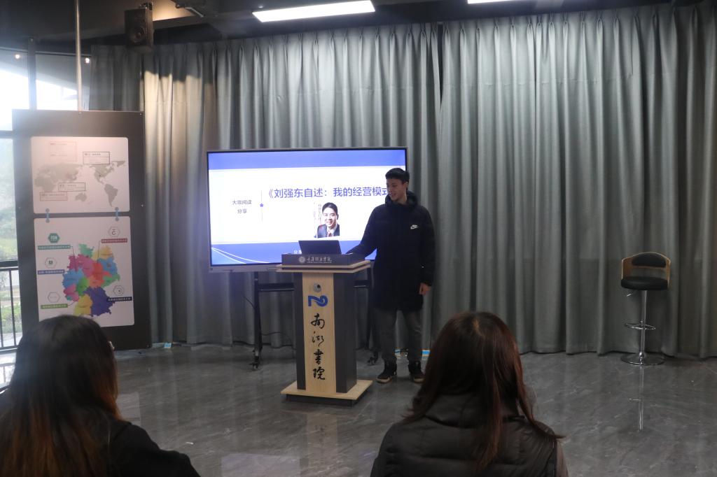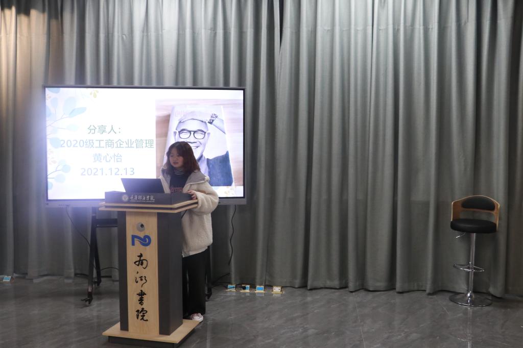 接着,黄心怡同学给大家分享了《创始人手记》,她认为这本书平易近人,就像是一位想要教育培养你的boss,而且是一个有情怀保持文艺和初心,但不失理性商业的boss。有点威严,有点距离,但又有点亲切的,和你娓娓道来关于如何思考,如何生活,如何工作。用思维和方法,让你自己去思考和实践未知的你,包括你的工作、生活和人生。杨雨霖同学带来的是《刘强东自述:我的经营模式》,价值观是一个企业最核心的东西,人也是一样,正气、善良的特质是需要我们一辈子坚守的“核心价值观”,即使没有事业上的成功,也做到了“仰不愧天”。