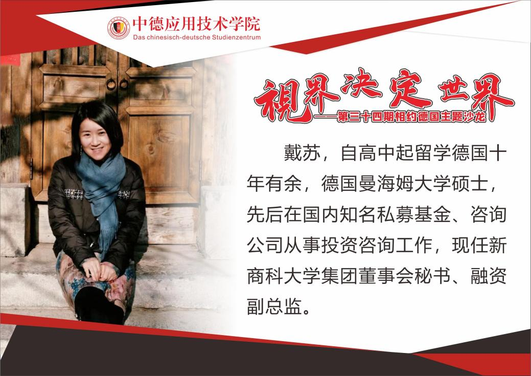 走不出去,眼前就是你的世界;走出去,世界就在你眼前。机会都是留给有准备的人,敞开自己的心扉和眼界,会让我们发现现实离目标并不是很遥远。为了让同学们更好地开眼看世界、树立自信、迎接未来挑战,中德应用技术学院于12月15日15:00,在南湖书院中德创意工坊举办了第三十四期相约德国主题沙龙——视界决定世界。本期邀请到的主讲嘉宾是新商科大学集团董事会秘书、融资副总监戴苏老师。