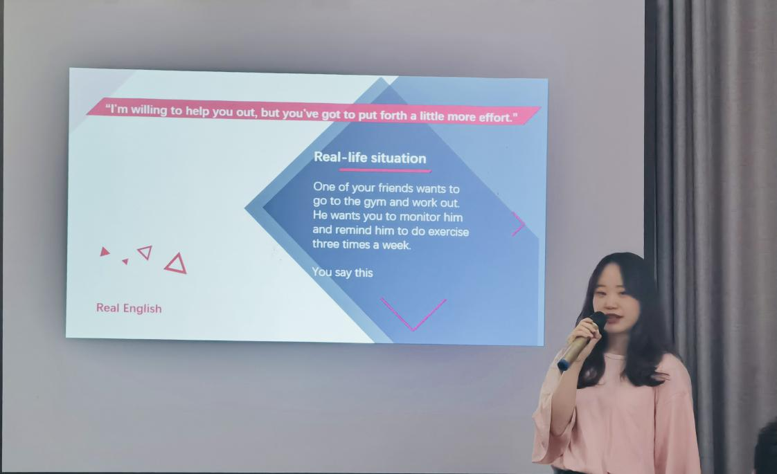 首先她开门见山,直接点明了情景学习法在地道英语口语表达学习中的重要性,要求同学们应当摆脱以往词汇和语法相分离的固态学习思维,通过一句英文“I'm willing to help you out, but you've got to put forth a little more effort.”设置相应的情景,借willing,help you out等词强调语音练习时发音能更加连贯和流畅;用willing,you've,effort示意同学们重视音调,着重强调一句话中的重点信息,并学会将自己置于情境当中,带有停顿带有感情地朗读。在座的同学们无一不上口练习,积极展示着自己声情并茂的英语诵读,通过用词组puts forth effort造句的互动让同学们感受到字里行间语意的细微差别和口语的独特。