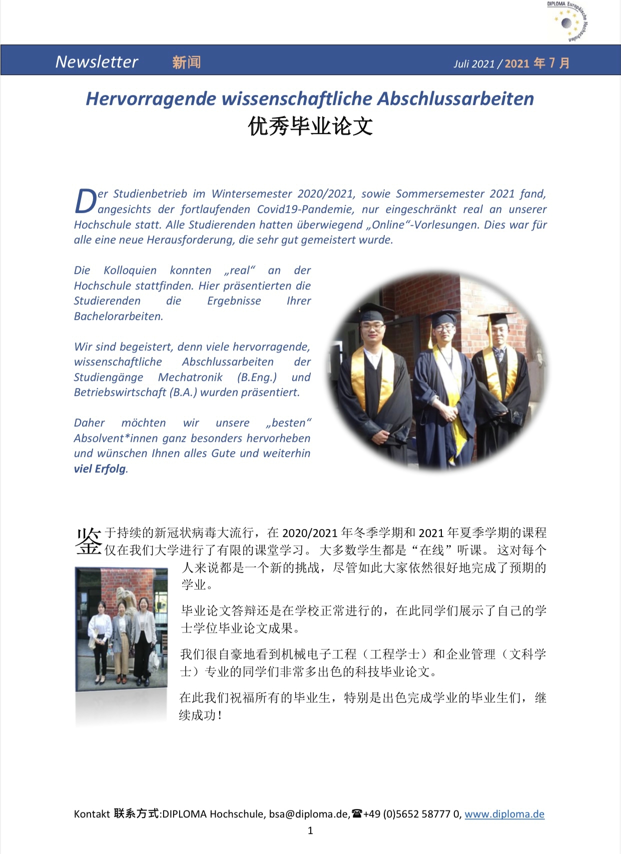 自新冠疫情爆发以来,德国北森应用技术大学从线下教学转为线上教学,为了保证毕业答辩的效果,让学生更好地展示毕业设计的成果,在保证师生安全的前提下,北黑森应用技术大学在学校内举行了线下毕业答辩。北黑森应用技术大学新闻报道中写道:“Wir sind begeistert, denn viele hervorragende, wissenschaftliche Abschlussarbeiten der Studiengänge Mechatronik (B.Eng.) und Betriebswirtschaft (B.A.) wurden präsentiert.”译:我们很自豪地看到机械电子工程(工程学士)和企业管理(文科学士)专业的同学们写出了非常多出色的毕业论文。
