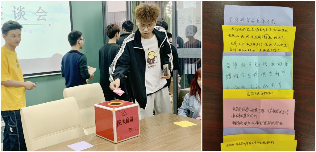 座谈会时间虽然短暂,还有很多同学把想要提出的问题或建议意见留言在卡纸上,投入院长信箱中。相信通过本月的座谈会,同学们会认真总结,继续在未来的道路上扬帆远航。