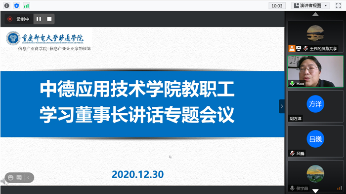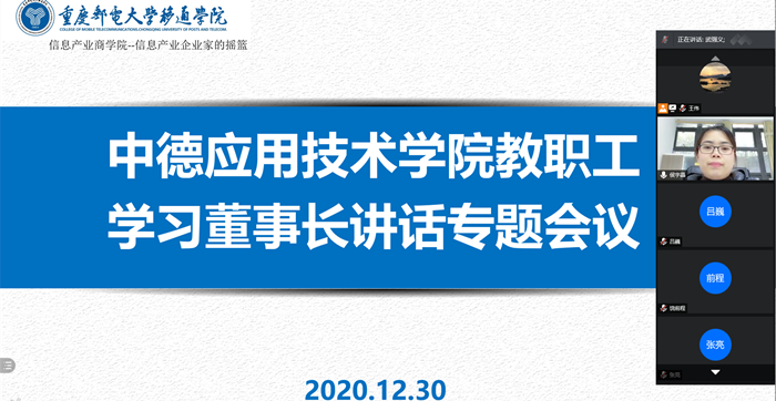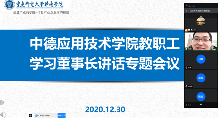 为传达并贯彻落实董事长彭鸿斌先生近日与集团三校商科教育、通识教育、名师课堂、创意写作团队及学校钓鱼城科幻中心全体教职工重要讲话精神,了解集团战略层面未来发展蓝图。12月30日下午,我院在线上开展“中德应用技术学院教职工学习董事长讲话专题会议”,在院长尹浩亮及副院长侯宇晶、武强义三位同志的带领下对董事长讲话精神进行深入学习。