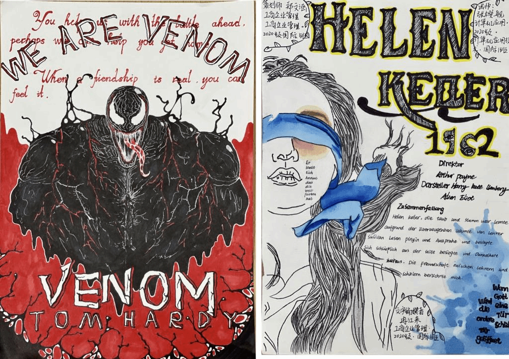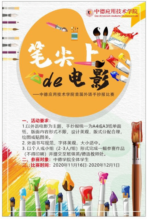 为全面提升中德学子外语语言综合素养,极大程度丰富我院学子的课外生活与精神世界,增强学生集体合作意识,活跃校园外语文化,我院于12月成功举办以“笔尖上的电影”为主题的外语手抄报活动。在老师们积极组织安排下,中德学院各年级同学们踊跃参加。