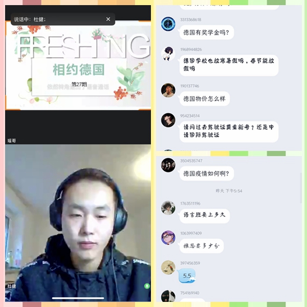在这个特殊的时期,对于即将出国或者期待留学的学弟学妹们来说,出国好像变得有点复杂,不确定因素增加。杜健学长表示,同学们应该做好准备,等到好消息的到来。出国留学房租大概是多少,德国同学友好吗,现在德国疫情严重吗,申请研究生困难吗……一团团疑问围绕着中德学子。带着疑问,本期相约德国,杜健学长则会为同学们一一答疑解惑。