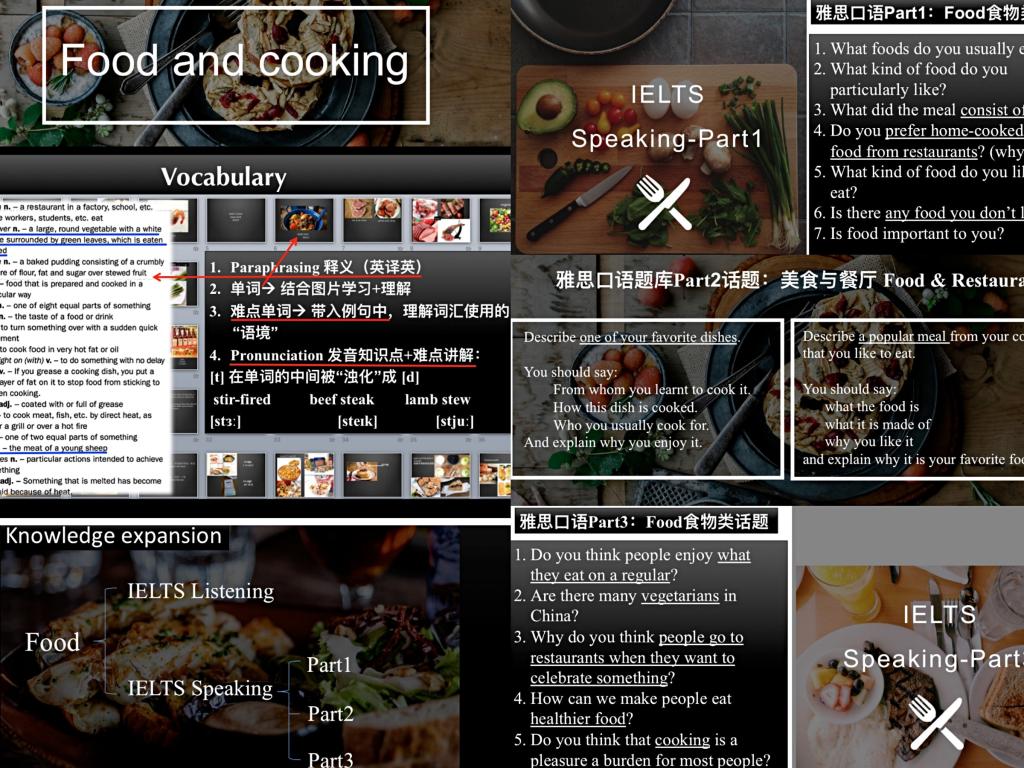 其次,李老师以雅思口语热门话题“食物类”作为切入点。李老师强调,学习方法远大于学习知识的本身。在雅思教学中,李老师运用建构主义教学法与情景演练法引导学生对雅思词汇的大胆表达与运用。她提到,当学生在情景演练中出错时,可先通过班级同学进行评价与纠正,教师进行总评,最后师生共同总结,这样不仅能有效促进同学们的雅思水平的提高,更加能帮助同学们找到正确的有效学习方法。