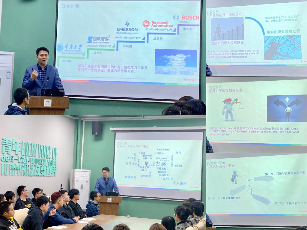 讲座伊始,王经理以一段幽默风趣的博世自治短视频开启了当晚别开生面的讲座。作为一名“世界博世人”,王经理以图文并茂的方式向全体师生介绍了博世集团的发展史、业务市场、以物联网为例的博世集团战略核心等方面,在场的每位师生都沉浸在这个世界百强企业的丰富而独特的企业文化盛宴。