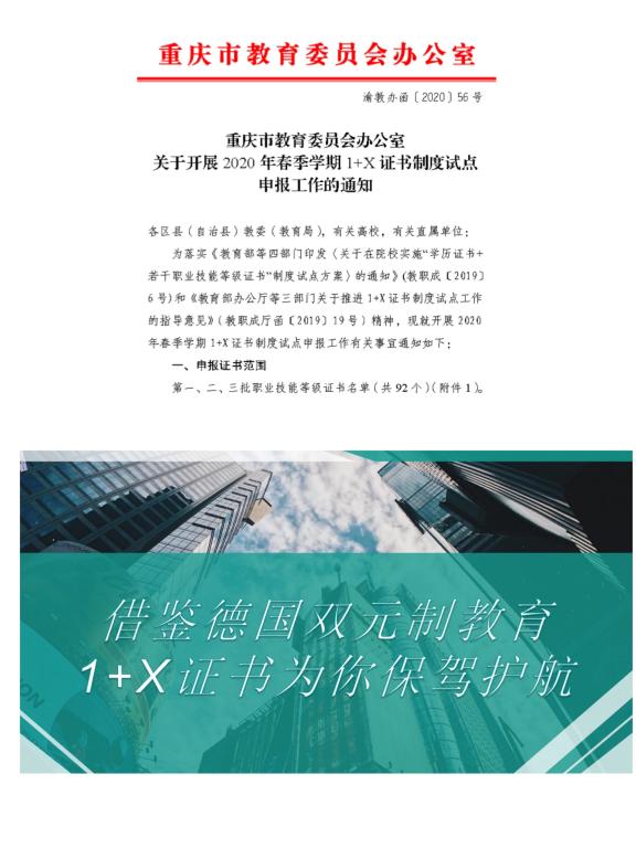 根据2019年1月国务院印发了《国家职业教育改革实施方案》(以下简称职教20条)的指导意见,把学历证书与职业技能等级证书结合起来,探索实施1+X证书制度,是职教20条的重要改革部署,也是重大创新。职教20条明确提出,“深化复合型技术技能人才培养培训模式改革,借鉴国际职业教育培训普遍做法,制定工作方案和具体管理办法,启动1+X证书制度试点工作。”我校与德国应用技术大学一直保持密切合作,在工程型、应用型人才培养方面积累了宝贵经验。我校结合自身优势,落实立德树人根本任务、完善教育和培训体系、深化产教融合校企合作等方面做了大量的工作。我校的人才培养定位符合服务地方和实现更高质量更充分就业需要。