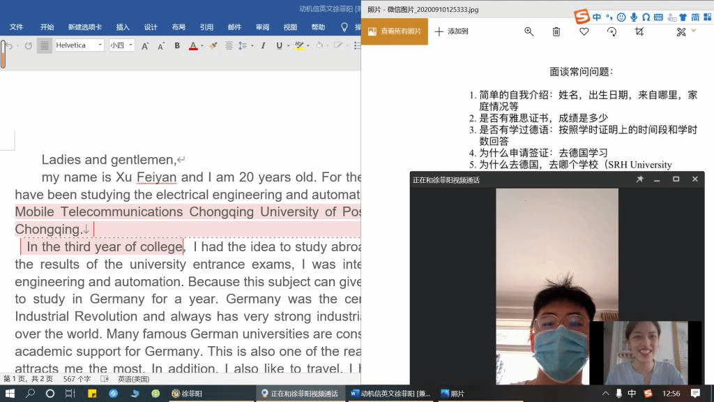 本次模拟面试由双语教研室的雅思教师团队严格按照德国大使馆的要求组织开展。在模拟面试之前,各位雅思教师们为出国同学们再次审查英文动机信,并提出修改建议。本次面试将38名同学分为三组,分别由三位有留学背景的雅思教师进行一对一的视频指导,做到专业性与针对性。强化预赴德留学生的语言能力和综合能力,让同学们载着实力踏上德国留学之旅。