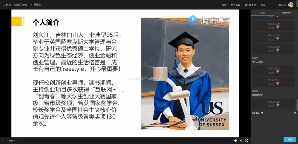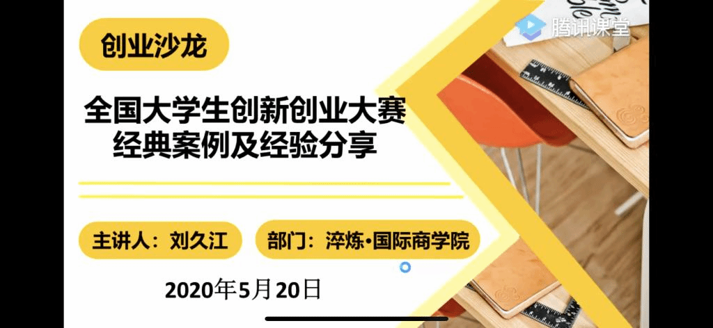 为培养大学生创新意识、启迪创意思维、提升创造能力、造就创业人才,积极备战2020年重庆市“渝创渝新”选拔赛暨合川区第九届创业创新大赛由就业创业指导与服务中心主办,中德应用技术学院承办的第28期创业沙龙于2020年5月20日下午5:00通过腾讯课堂的方式开展了以“全国大学生创新创业大赛经典案例经验分享”为主题的创业沙龙活动。此次活动邀请了淬炼商学院刘久江老师以直播的方式,与120余名中德学院学子分享了一些参加全国创业大赛的经历,也分享了创业大赛对提升能力有很大的帮助。