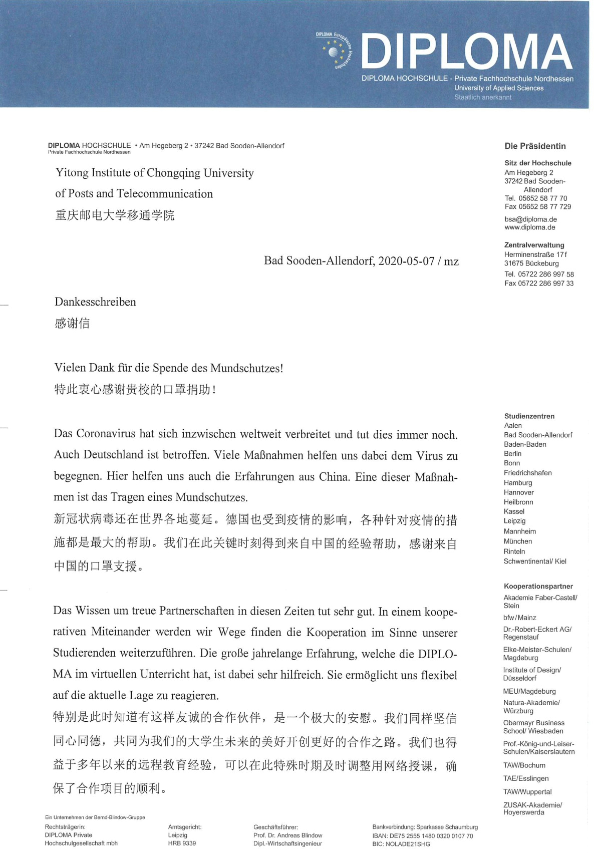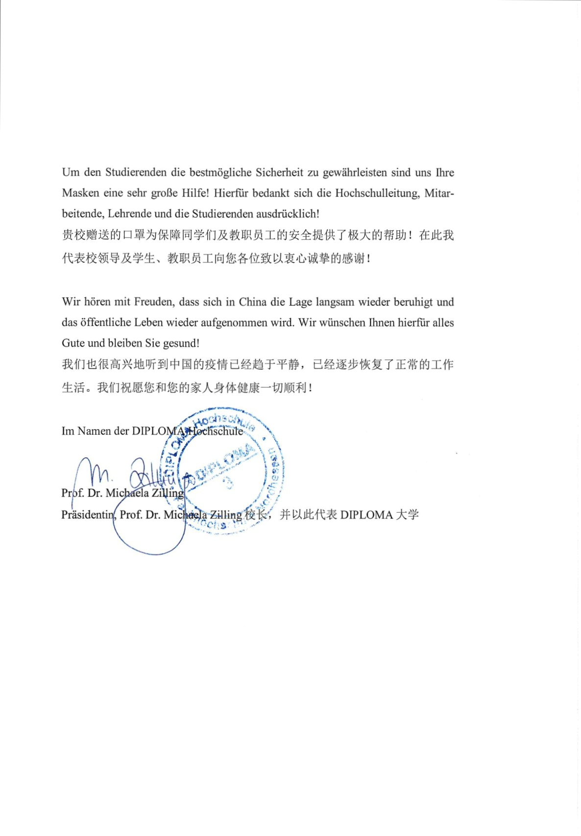 同时,学校向德国北黑森应用技术大学表示慰问,表达了共同抗疫的态度和坚定的信心。加强合作与沟通,做好我校预备赴德留学生和在德留学生的教学与管理,做到“停课不停教,停课不停学”,尽量做到不影响学生留学进程。德国北黑森应用技术大学校长Michaele Zilling教授向学院发来感谢信,对这份深厚情谊表示由衷感谢,并表示疫情期间做好预备赴德学生和我校在德留学生的教学安排和学生管理,确保留学生的安全。中德双方共同努力开创更好的合作之路。