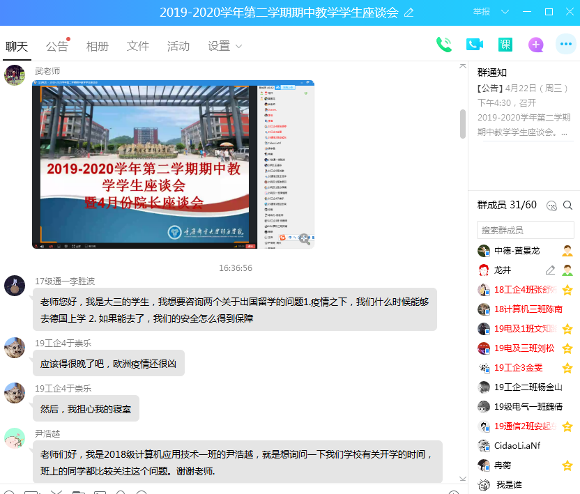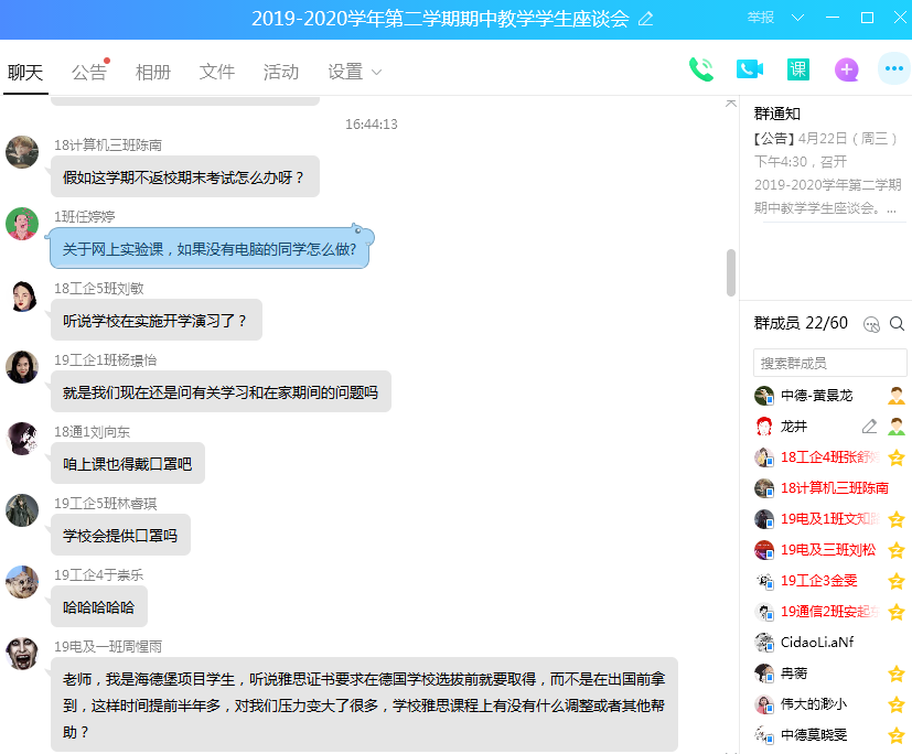 “我们这学期还能不能返校”,返校后会隔离吗”,“学校会提供防疫物资吗”“受疫情影响,我们还能不能按时赴德留学”“住宿费会不会退还”“期末考试如何进行”……隔着屏幕,焦虑扑面而来,这是一次如约而至的师生座谈会,也是一次特殊时期的“云”端对话。