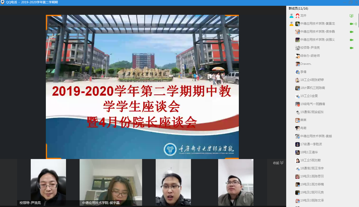 4月22日16点30分,中德应用技术学院通过QQ网络直播的形式举行了4月份院长座谈会暨期中教学学生座谈会。学院院长尹浩亮,副院长侯宇晶、武强义,综合办及学工办相关教师和各年级50余名学生代表参加了本次座谈会。