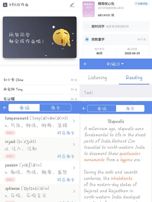 老师们首先体验了许多热门记单词app,比如百词斩、扇贝单词、有道背单词、乐词、沪江开心词场等,最后决定利用小站雅思单词平台,其优势在于雅思针对性强,不仅有真题原句,还可以按照每套题的听力和阅读部分记忆,非常系统。2018级首先自3月19日正式开启打卡,反响强烈,打卡热情高,有的学生每天起床第一件事就是打卡记单词,有的学生会超额完成任务,有的学生会在群里讨论单词释义,更有学生已经具备了‘批判性思维’,当发现了App出现的细微错误时会及时沟通,并将问题反馈给平台客服。
