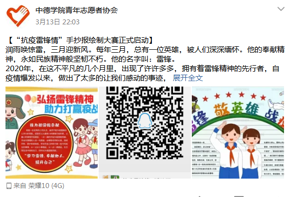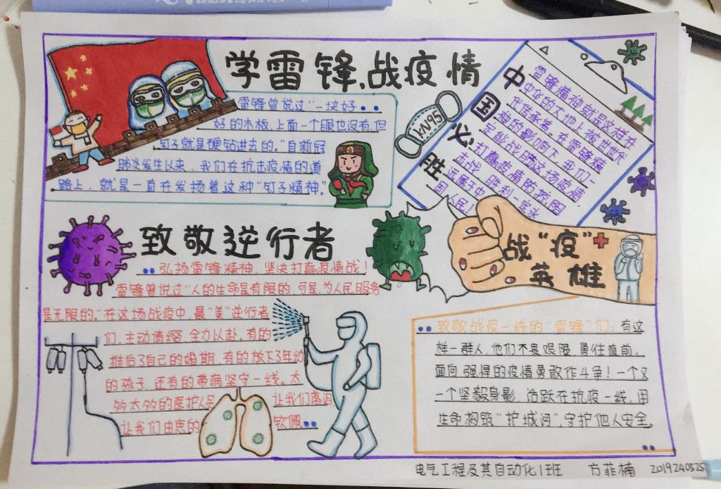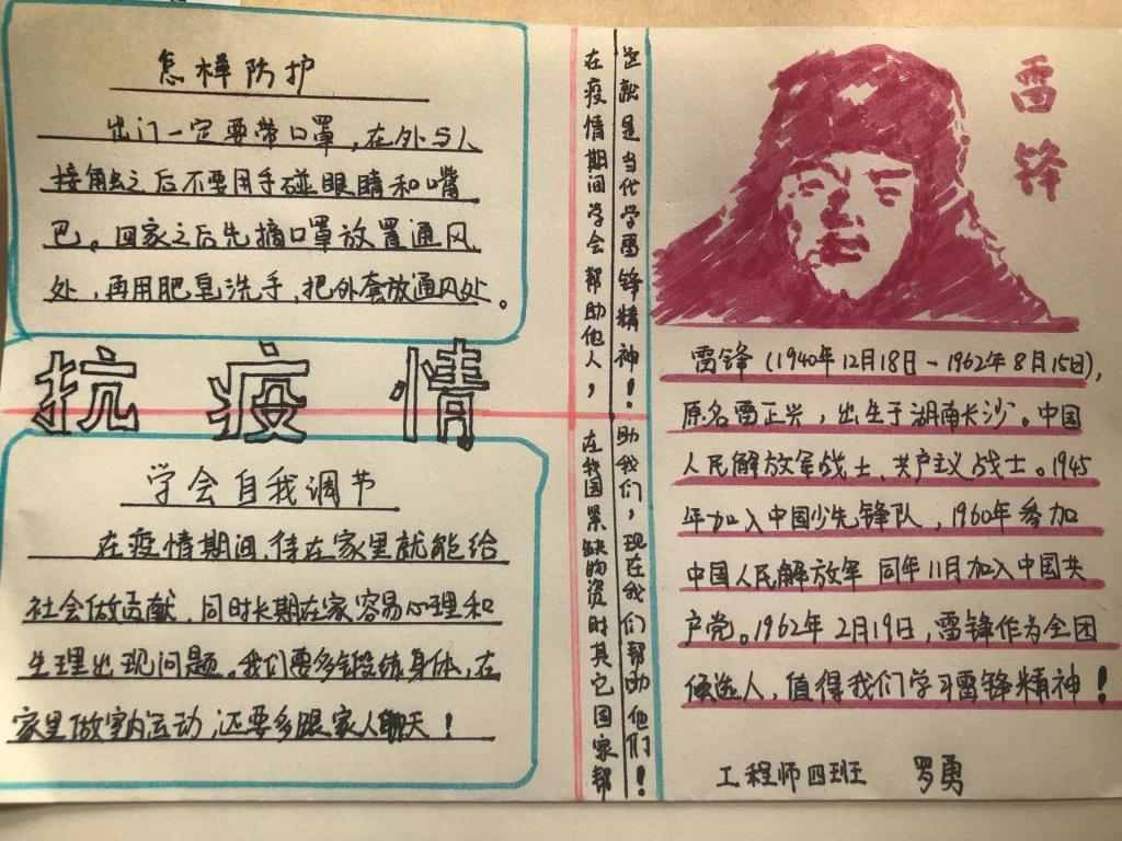 乙亥末,庚子初,荆楚大疫,在此举国惶恐之际出现了许许多多值得我们学习的榜样,他们化身逆行者,活跃在我们的身边,活跃在我们最需要他们的时刻,他们身体力行着向我们诠释着我们这个时代的“雷锋”精神。3月是雷锋月,宅在家中的我们,该怎样学习雷锋精神呢?为了弘扬雷锋精神,致敬抗疫英雄,普及志愿服务理念,提高青年团员素质,中德学院于2020年3月12日由学院的青年志愿者协会承办了为期十天的“抗疫·雷锋情”主题手抄报制作活动。