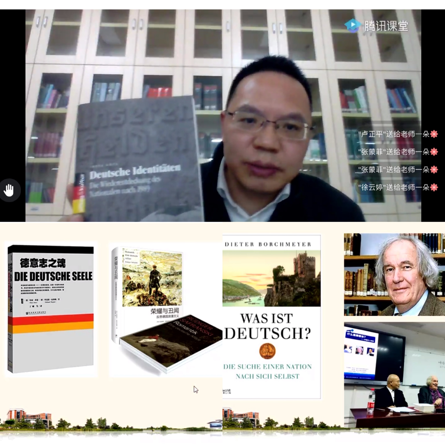 课堂上,随着李教授首先以德国人的两种灵魂为引导,从国名由来、德意志民族的文化、历史以及经济发展等多个方面进行介绍的讲解模式。什么是德意志?这个问题的神秘面纱在同学们心中被层层揭露,每位同学对这个问题都有了自己独特的见解,大家都在直播间内以留言的形式争取与李教授互动交流的机会,一时间,百余人众的直播间竟人声鼎沸,热闹非凡,和蔼可亲的李教授也为同学们的热情与无限的好奇所打动,尽己所能回答每一位同学提出的问题,积极回应同学们独特的见解,以我国民族精神、文化与西方进行对比,论述各自优点,为同学们拓展思维,正所谓学而思其惑,思而解其迷,为学之境地。在这种热烈学习氛围之中,同学们都定能有所学,有所长。随后,李教授又以德意志文化为出发点,将内容拓展到了世界主义和民族主义以及犹太文化、以及一个个让人耳熟能详无法忘怀的名字;歌德、贝多芬、马克思、恩格斯等,以他们的名人传记,多方面的向同学们介绍了德意志文化,以这种极具亲和力的方式,让看似枯燥且高深的问题真正落到实地。