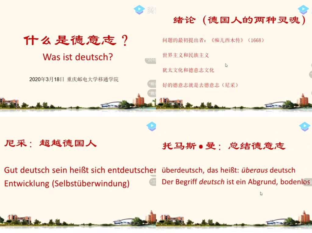 “好的德意志就是去德意志”这一个看似简单却无从说起的问题,是西方现代哲学开创者尼采的名句。南湖书院名誉院长李大雪教授系列精品课之第二期《什么是德意志》在同学们的期盼中于2020年3月18日16:00时如期而至。在这段特殊的时期里,虽然因为疫情将师生困在家里,暂时还不能返校,但是始终无法阻挡同学们对知识的渴望,对未知事物的探索。经过前期学生调研,征求意见,决定精品课由线下转移到线上,这一新的方式也更为同学们所喜爱,反响热烈,还未开讲,直播间已有许多同学上线等候,热闹非凡!
