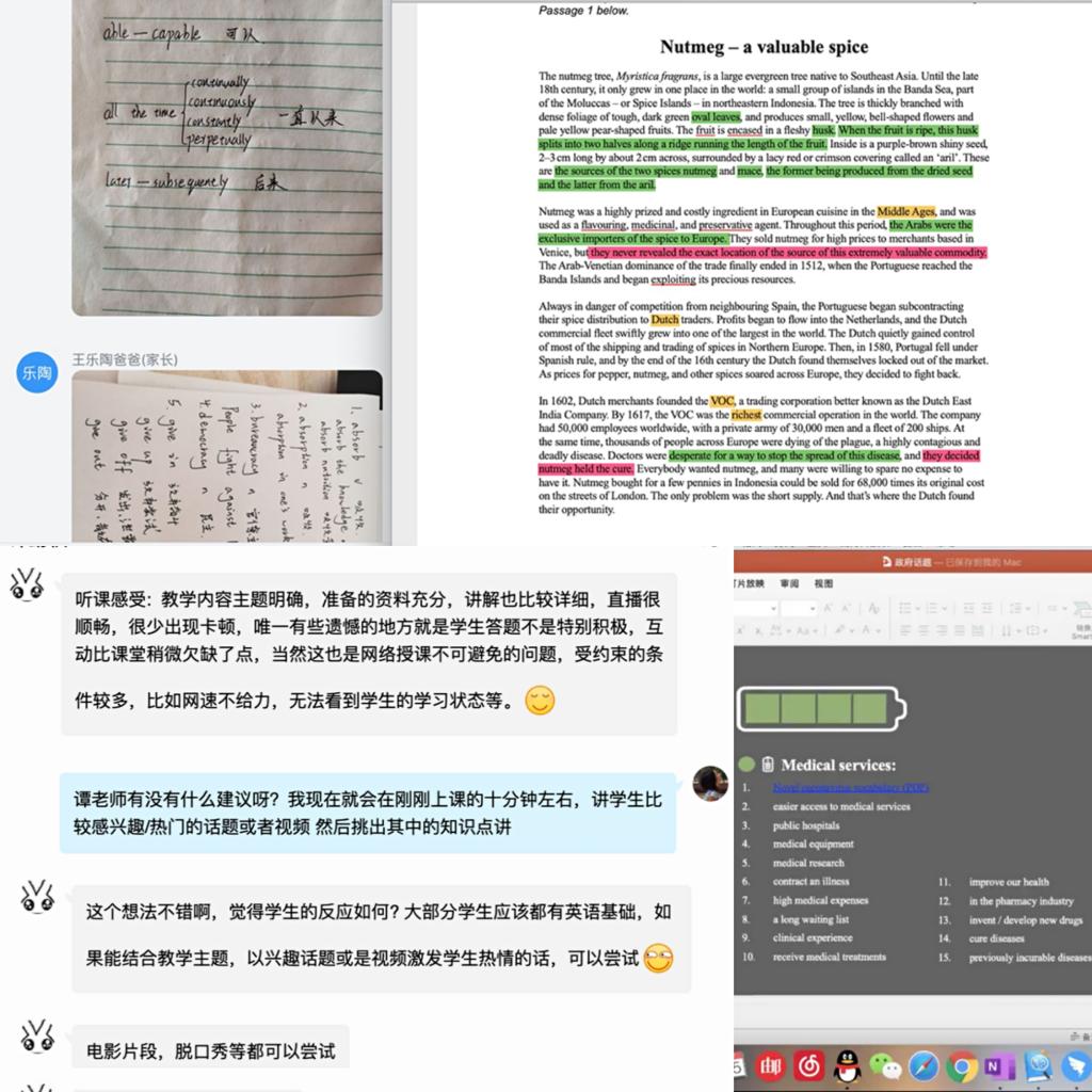 老教师们首先充分肯定了各新教师的努力和教学水平,鼓励其优点;其次给予了改进建议:针对新老师刘老师的课堂,指导老师王老师指出授课内容相对较多,需要考虑到网络教学的实际困难和问题,与线下授课模式各取所长,理解学生学习效率降低的情况,适当调整教学进度和难度,适度降低对学生的要求;针对钟老师的课堂,指导老师张老师指出词汇讲解要详细深入,并充分抓住学生的薄弱环节,提高核心词汇量积累,打牢基础;针对向觅的课堂,指导老师谭老师指出应不断探索如何调动学生的积极性,比如利用电影片段、脱口秀等,配以比赛等形式,并结合奖惩措施,软硬兼施;针对李老师的课堂,指导老师陈老师指出要重视线上课堂管理,严格把控学生出勤情况,并和辅导员保持沟通,提高学生对考勤的重视度。