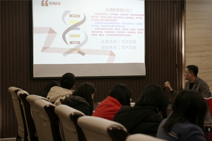 紧接着,穆部长详细讲解了“完满教育”四大板块——社团活动、志愿服务、竞技体育、艺术修养与实践,并分别就四大板块的“3度+”社团活动体系、“1246+移通志愿服务2.0+新体系”、“三个一”特色竞技体育体系、“两节”“多赛”活动体系做了展开介绍。