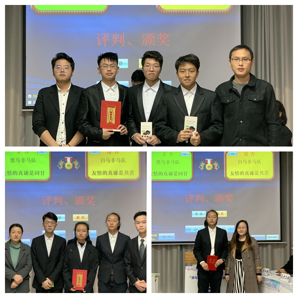 比赛结束后评委老师对每一位辩手都给予了肯定,主要说明了友谊不是单一而论,并不需要将友谊的真谛理解的太过片面,且辩论过程中需要引入更多的论据来论证己方的观点。经过几位老师的点评,相信每一位选手都获益良多。之后到了最激动人心的评奖环节,主席宣布了此次比赛的最终结果:正方获得本次比赛的一等奖,反方二辩以91分的个人成绩获得“最佳辩手”的荣誉称号。最后,评委老师,参赛选手和观众一起上台进行了拍照留念。