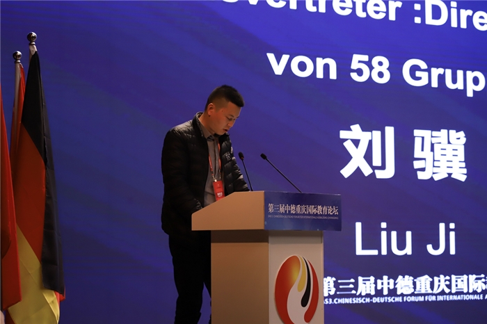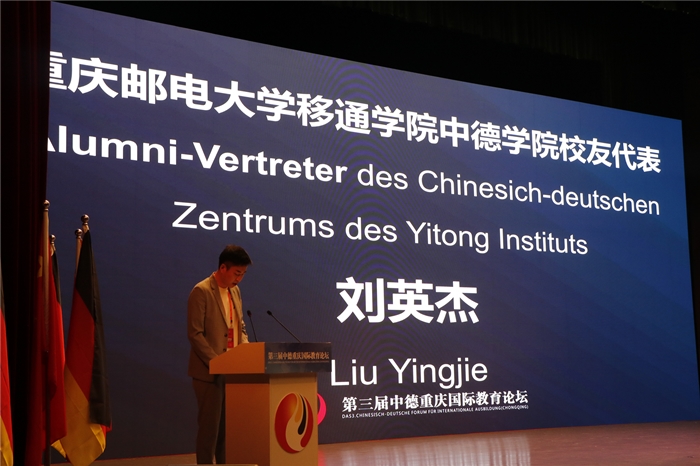 毕业于中德学院2011级电子信息工程专业的刘英杰作为中德学院校友代表作了发言。他回忆与分享了自己在德国留学时的经历和收获,他告诫学弟学妹们,作为你们的学长,非常愿意和你们分享我的留德感悟,希望哪怕只是一句话,如果能对你们的大学生活有所启迪,都是我的荣幸。请珍惜你留学德国的机会,就像电影《霍比特人》里所说:世界并不在你的地图与笔记里……当你回来时,你从此与众不同。留学最吸引我的,是无限种可能。人的生命是短暂的,你不可能经历所有的精彩,学习和经历本身正是帮助你梳理你未曾经历过的精彩。