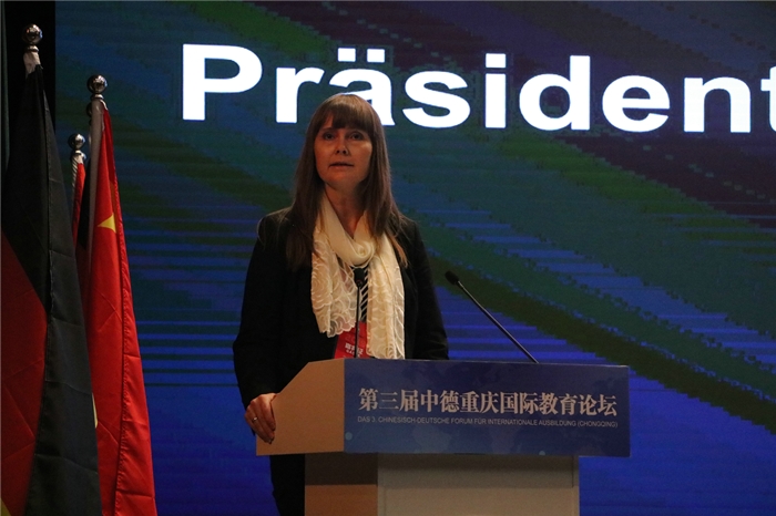 北黑森应用技术大学校长Michaele Zilling发表讲话,她说,能够在今天的第三届中德国际教育论坛开幕式上致辞,我感到特别荣幸。这样一个顶级国际教育会议的举办是非常值得高兴的,对此我要特别感谢重庆邮电大学移通学院。作为大学校长,还是大学的讲师,近年来我一直关注着德国以及中国高等教育领域的快速变化。在中德两国,学生不仅对知识和理解的能力,而且在个人能力及社会交往能力的提高也变得越来越重要。这种思想并不是新的。早在2000多年前孔子生活的时代,他就已经做了思考:“学而不思则罔,思而不学则殆。” 大学毕业生应在工业4.0以及“中国制造2025”战略计划的背景下,了解这两个战略改变了许多职业,因此不仅要理解,而且要有有创新以及解决创新任务的能力。迅速增长的数字化在中德两国都在发生,这意味着现在所熟知的,也许未来却不复存在。我满怀信心地期待中德两国的大学能继续成功合作,并很高兴能够与当今和未来的合作大学代表进行建设性和前瞻性的讨论。