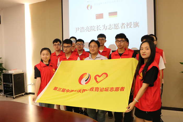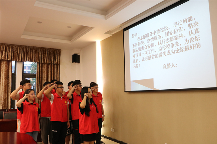 随后,论坛志愿者上台庄严宣誓,承诺将充分发挥移通人的精神,展示出我校师生的昂扬风貌。尹浩亮院长为志愿者代表授旗。