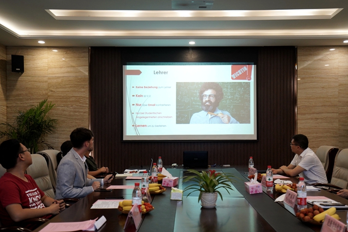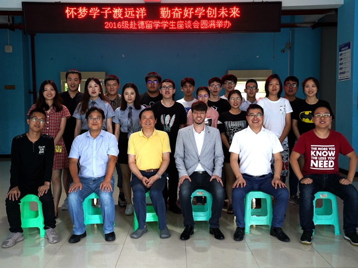 放飞梦想,展翅翱翔,你们的未来就在前方,中德应用技术学院于2019年6月21日下午15:00整在中德会议室召开了2016级赴德留学学生座谈会。参加本次座谈会的嘉宾有重庆邮电大学移通学院校长张德民教授、校长助理,中德应用技术学院院长尹浩亮、国际处韦橙橙老师、外教李成老师、德语教师代表吕巍老师、中德学院全体辅导员老师及2016级赴德留学学生代表共计25人,会议由副院长武强义老师主持。
