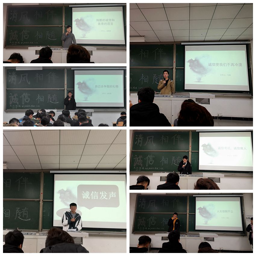 俗语说:人的嘴巴所表达出来的都是最迷人的字眼,倾吐的是最真挚的情感。而这”最迷人的字眼”,“最真挚的情感” 全产生于做人最基本的诚信血液。书上解释说“诚信”, 即诚实守信,“诚”,就是内诚于己、诚实无欺、诚实做人;“信”,就是外信于人,有信用、讲信誉、守信义。诚信就像一股血液,是我们做人之根本!12月18日晚7点,伴随着《诚信之歌》由中德应用技术学院2018级电气自动化技术(中德)3班承办的“清风相伴,诚信相随”主题年级会拉开了帷幕。