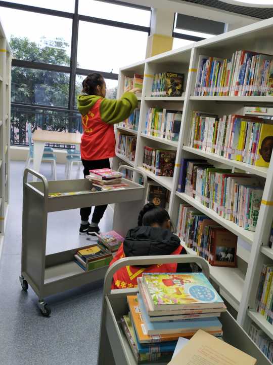 见到图书馆负责人,了解到我们今天的工作——“倒柜”,就是把几个书架上的书交换一下位置,似乎听来无聊了点,但还是很开心能参与到其中。根据分工,我和另外一个女生负责把书装在车上从国内外文学书架转移到散文书架,同时把散文放到国内外文学区域。少说多做,抓紧每分每秒,穿上中德应用技术学院志愿者的红色马甲,我们马不停蹄的开始了各自的工作。“这么冷的天,你把衣服脱了不冷吗?”“还好吧,一会儿你就不仅不冷,还会很热。”事实证明他是对的,才转移“精神食粮”两次,我就感受到了志愿服务的热情,感受到了重庆酷冷11月的热情。