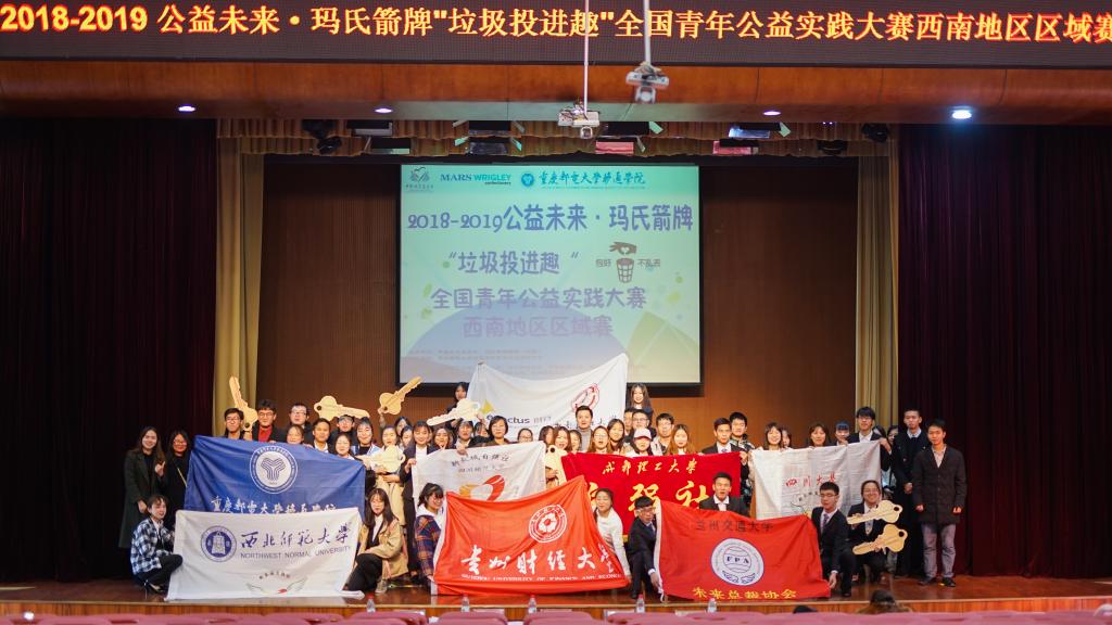 2018年11月25日上午9:00,2018-2019公益未来·玛氏箭牌“垃圾投进趣”全国青年公益实践大赛西南地区区域赛在我校下里巴人剧场隆重举行,本次比赛由中国扶贫基金会、玛氏箭牌糖果(中国)主办,重庆邮电大学移通学院承办。有来自四川大学、四川师范大学、成都理工大学、西北师范大学、贵州财经大学、云南师范大学、西南民族大学、兰州交通大学、西南交通大学等高校的27支队伍参加此次区域赛。