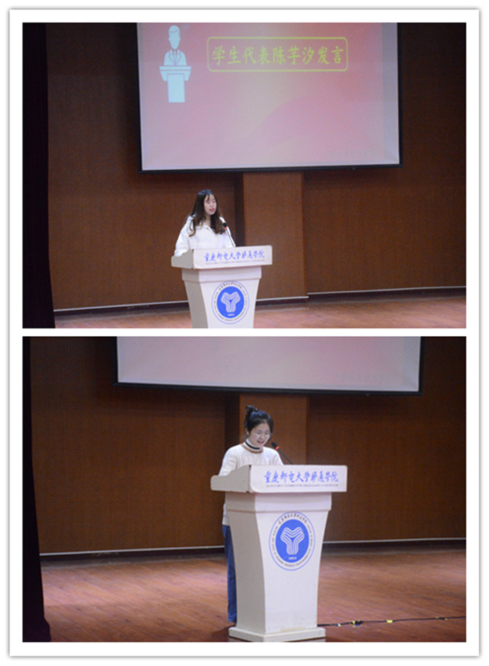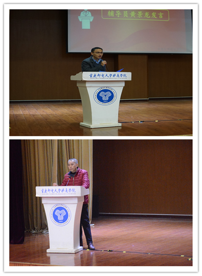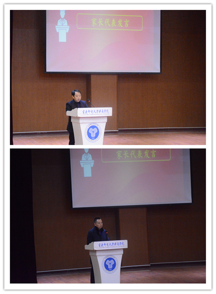 紧接着,2016级的辅导员黄老师和肖老师依次上台致辞。两位辅导员的致辞十分朴素和接地气:大三马上要毕业了,要尽早的确立目标、确定未来发展的方向;家长要听取孩子心声,帮助孩子做好接下来的生涯规划。学生代表的发言,表达了对学校和父母的感激,而家长代表的发言则表达了对学校辛苦培育孩子的谢意和孩子在大学里面慢慢成熟的欣慰。人生就像一场不能回头的旅行,在每一个分叉路口都是一次重要的选择。