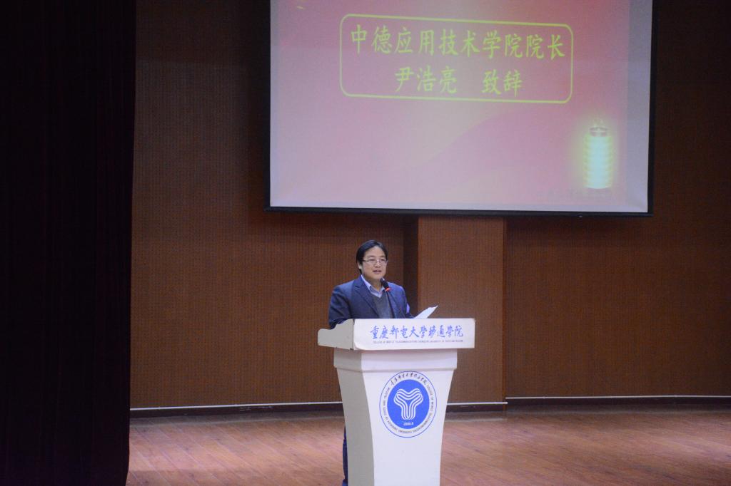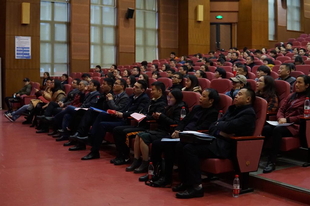 朝阳初生,缕缕薄雾。第二天早上8:30,学生家长不顾晨寒,早早来到了下里巴人剧场,提前领取学院为家长们精心准备的资料袋后纷纷在赠言寄语板上留下对孩子和学校的美好寄语。9点整,本次家长开放日的家长会环节正式拉开序幕,中德学院院长尹浩亮、学生处副处长陈帅、中德学院副院长武强义、综合办主任廖梅梅、德语教研室主任张洋、外教Patrick(李成)以及全体辅导员参加了本次会议。会议伊始,首先播放了2016级专科学生的成长视频。视频里面一张张青涩的脸庞、一段段经典的校园故事、无不昭示着孩子们在大学生活中成长和成才的过程。家长们看着孩子由初来乍到的陌生到逐渐适应后的成熟,脸上泛起了由衷的笑容和泪光。