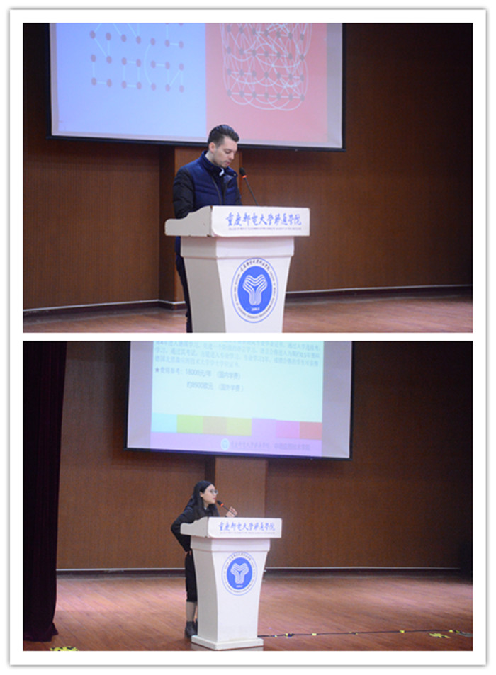 2013级已经留学德国的学姐陈俊琪特地为此次会议录制了一部描述她留学德国经历的小视频,为学弟学妹留学德国提供参考。外教Patrick(李成)和吴德艳老师为大家重点介绍了中德文化的差异和留学德国的整个流程。